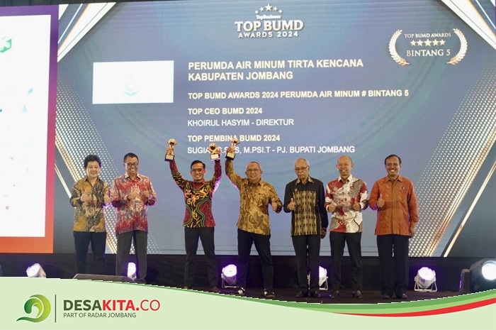 DesaKita.co – Perusahaan umum daerah air minum (Perumdam) Tirta Kencana Jombang meraih tiga penghargaan dalam Top BUMD Awards 2024. Pertama, Perumda Air Minum Predikat Bintang 5 atau excellent. Kedua, predikat Top CEO BUMD bagi Direktur Perumdam Tirta Kencana, Khoirul Hasyim. Ketiga, Top Pembina BUMD kepada Pj Bupati Jombang, Sugiat.