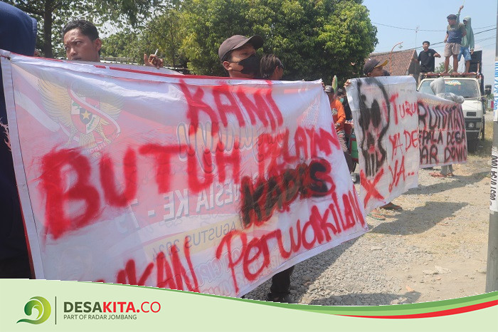 Di antara spanduk bertuliskan ‘Kami Butuh Kades yang Bisa Merakyat’, ‘Kami Butuh Pelayanan Bukan Omongan’, ‘Butuh Kades yang Bisa Ngayomi Masyarakat’, dan juga tulisan ‘Turunkan Kepala Desa Banjardowo’.