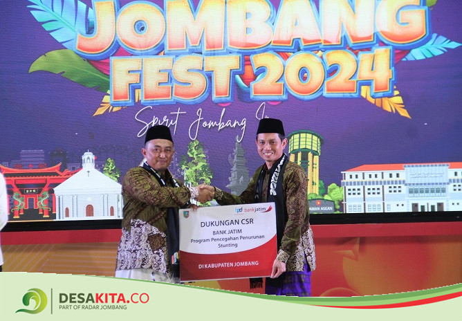 Dukungan corporate social responsibility (CSR) program pencegahan penurunan stunting secara simbolis diserahkan Pemimpin Cabang Bank Jatim Jombang Hanif Julhamsyah kepada Pj Bupati Jombang Teguh Narutomo dalam kegiatan pembukaan Jombang Fest 2024 memperingati Hari Jadi Pemkab Jombang ke-114 di Alun-alun Jombang, Senin (14/10).