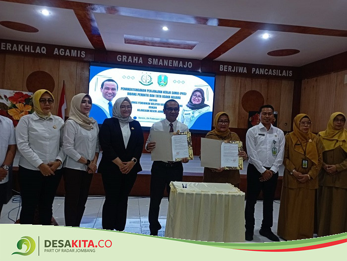 3. SINERGI: Kajari Jombang Nul Albar SH MH bersama Plt Kepala Cabdindik Jombang Evi Dwi Widajanti MM Menunjukkan naskah kerjasama.
