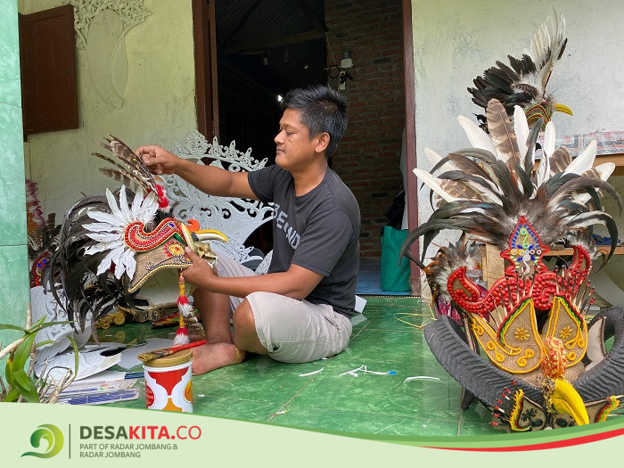 KREATIF: Hari Suciono, warga Desa Panglungan, Kecamatan Wonosalam saat membuat kreativitas kostum karnaval di rumahnya, kemarin (16/7).