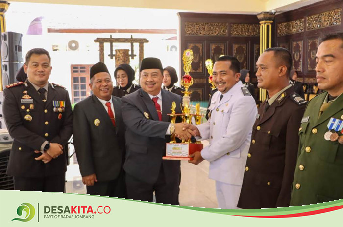 KOMITMEN KEAMANAN: Kepala Desa Mojotrisno Nanang Sugiarto menerima piala penghargaan juara 1 Kapolres Award Desa Aman 2025 dari Bupati Jombang Warsubi di pendopo Kabupaten Jombang, Selasa (1/7) pagi.