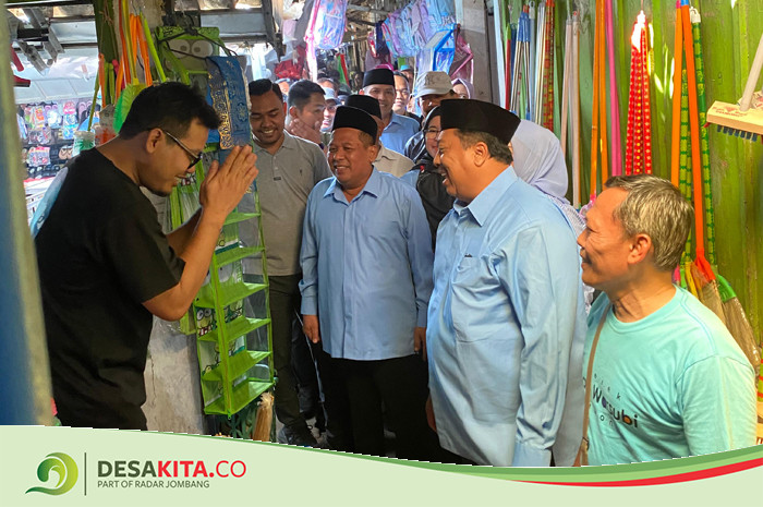 Sama-sama didampingi istrinya, Warsubi-Salman masuk ke dalam pasar menyapa satu per satu pedagang. Mereka menanyakan harga bahan pokok yang dijual di pasar.