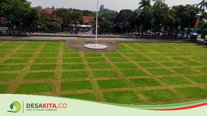 Desakita.co – Lapangan Alun alun Jombang dipercantik menyambut Hari Raya Idul Fitri. Rumput dipotong dengan motif kotak-kotak laiknya sarung.